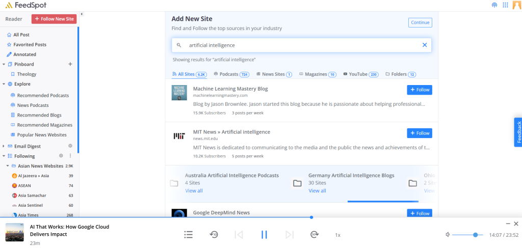 - Search “machine learning” or “artificial intelligence” and get manually ranked sources with subscriber counts, publication frequency, and credibility metrics. Instead of guessing blog quality, see how many already follow it. We built 50 feeds in 10 minutes using FeedSpot’s directory. Other readers required 2 hours for manual discovery and RSS link hunting.
