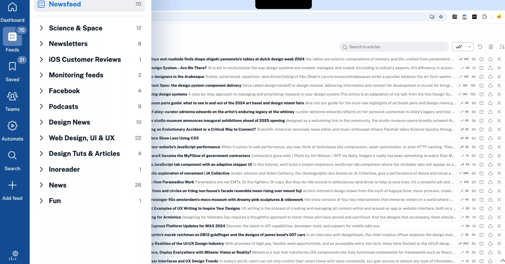 FeedSpot functions as a central reading hub. We open it in the mornings, scan 50+ feeds organized into folders in roughly 20 minutes. Unread counts display clearly at folder level, making prioritization effortless.